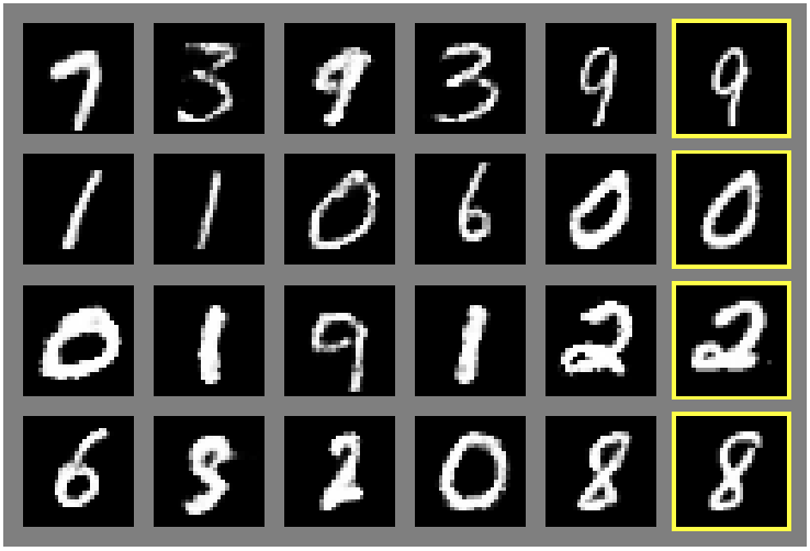 A Figura 2 mostra os dígitos manuscritos criados pelo gerador de uma GAN em suas primeiras cinco colunas e os dígitos manuscritos reais em sua última coluna.