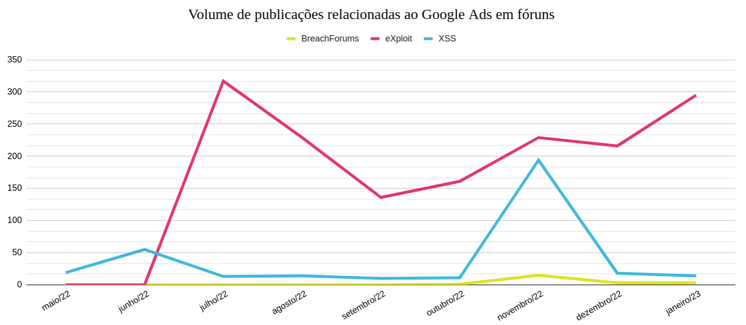 - Identificamos, também, um aumento de publicações relacionadas ao Google Ads em fóruns underground, especialmente no eXploit;