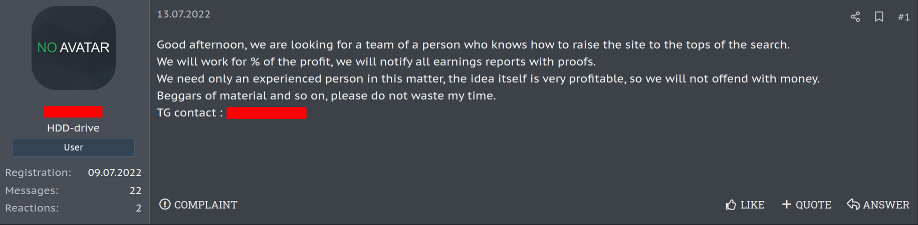 Com base em nosso monitoramento, identificamos um usuário no fórum eXploit cuja conta foi criada em 4 de maio de 2022, como sendo um dos principais fornecedores de serviços relacionados ao Google Ads. A conta possui um histórico de atividades com várias publicações relacionadas à auditoria, treinamento e serviços de anúncios em buscadores. Além disso, o usuário interage com outros membros do fórum respondendo dúvidas sobre o Google Ads.