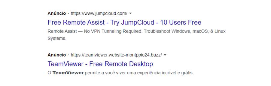 Para promover campanhas maliciosas, os cibercriminosos abusam desses recursos cadastrando keywords relacionadas a sistemas amplamente utilizados e softwares gratuitos com grande volume de download compatíveis com o sistema operacional Windows. No exemplo abaixo, o título e a URL do anúncio utilizam keywords relacionadas ao software de acesso remoto “Team Viewer”.