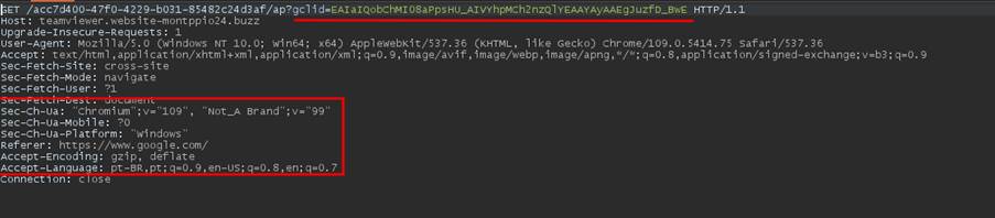 Este redirecionamento ocorre apenas caso a requisição HTTP contenha o parâmetro gclid, indicando que o usuário clicou no anúncio. No entanto, se acessada diretamente, sem que seja por meio do clique do anúncio, o redirecionamento não ocorre devido ausência do parâmetro “gclid” na requisição e portanto, nenhum comportamento malicioso é identificado. Esta configuração dificulta a detecção por mecanismos de defesa do buscador.