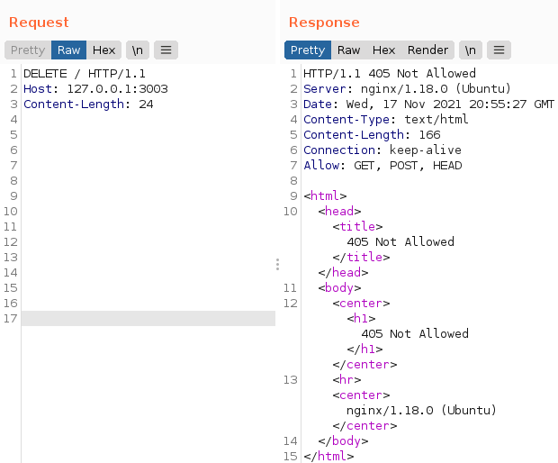 Para esse laboratório, o Nginx foi configurado para aceitar apenas requisições com os métodos GET, HEAD e POST. Qualquer outro método será impedido de seguir para o servidor. Porém, o servidor HTTP aceita, também, os métodos PUT e DELETE. Sabendo que ele aceita esses métodos, e também que eles costumam realizar algumas operações sensíveis, seria interessante para um atacante testá-los e ver o que poderia conseguir.