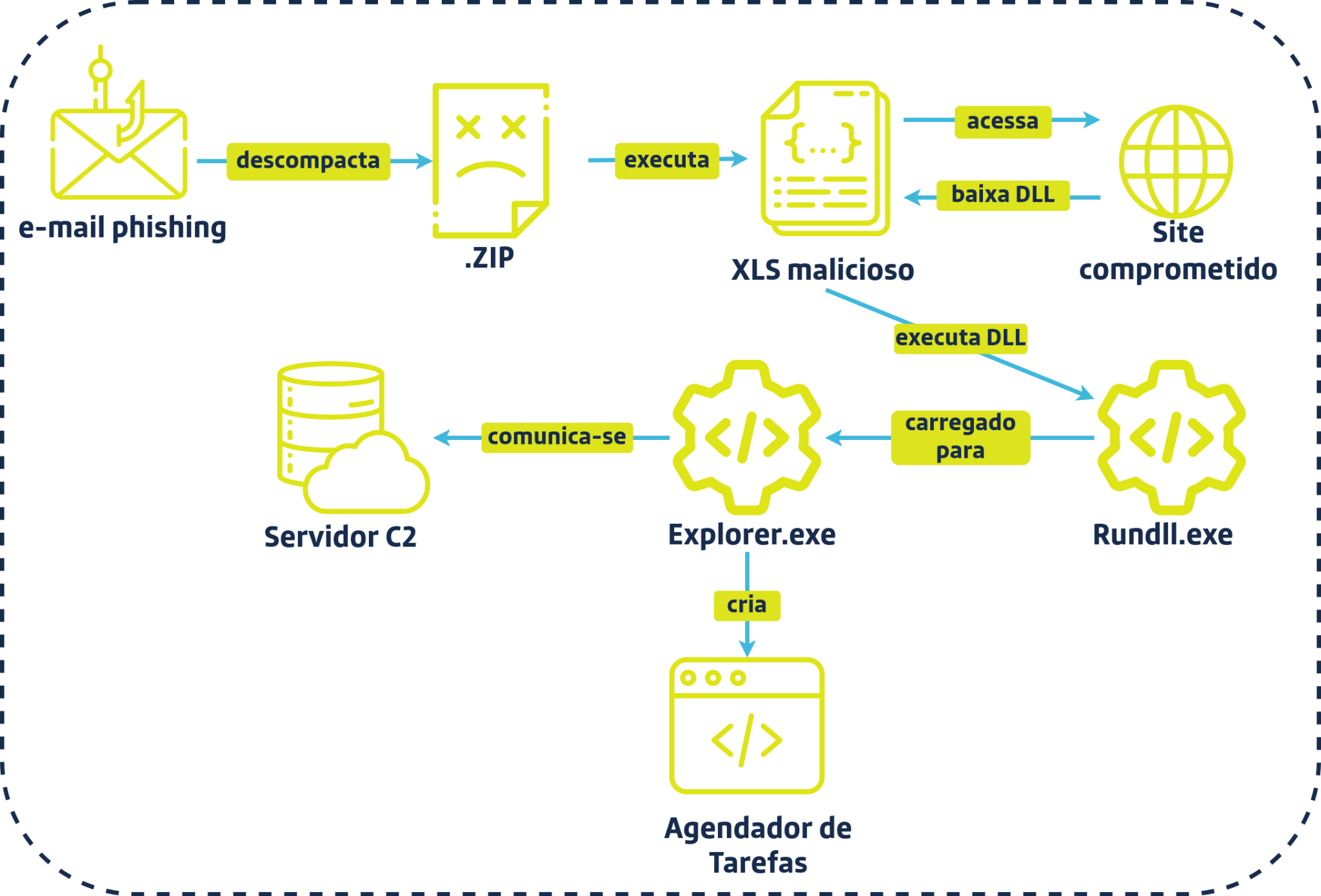 O monitoramento do time de Cyber Threat Intelligence (CTI) da Tempest reportou no mês de maio de 2021 uma campanha de phishing disseminando o ransomware Qakbot que, em sua cadeia de infecção (Figura 1), entregava um documento Excel carregando macro responsável por baixar uma DLL maliciosa através do utilitário rundll32.exe e em seguida extrair um payload de estágio final para iniciar o processo de encriptação.