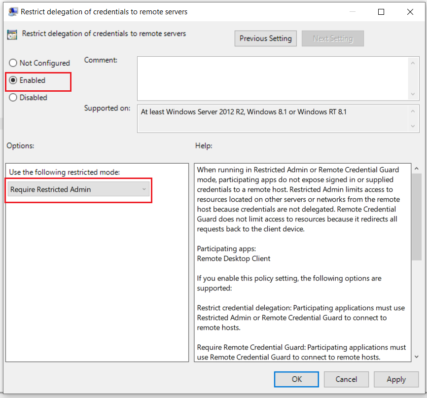 Para forçar os computadores clientes a fazerem uso do Restricted Admin Mode quando estabelecerem conexões RDP com os servidores do ambiente, é possível configurar a seguinte diretiva: