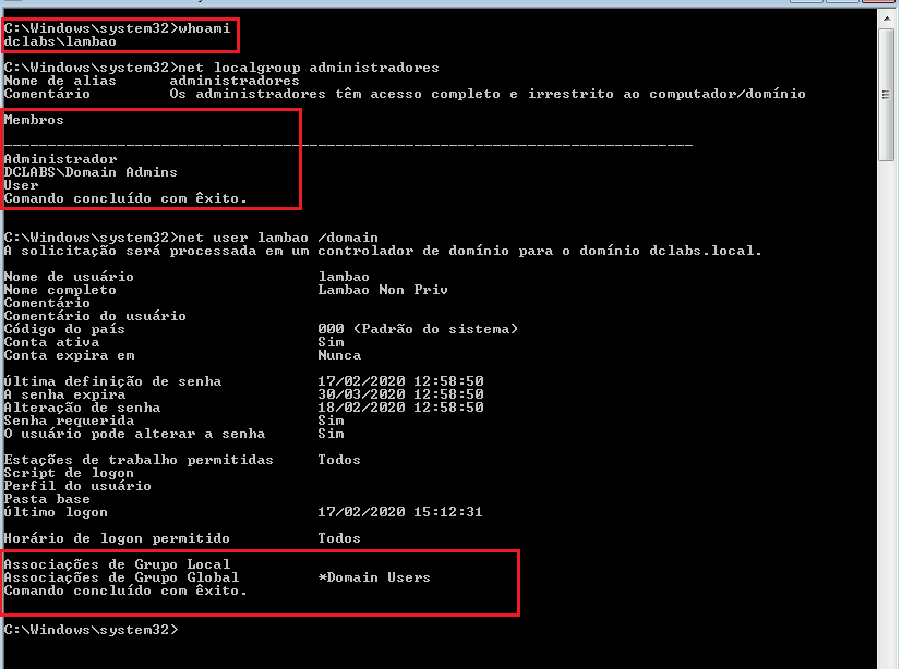 A partir da imagem acima, também é possível observar que a conta de usuário ‘lambao’ não pertence ao grupo local ‘Administradores’;14 e, no domínio, pertence apenas ao grupo padrão ‘Domain Users’. Ou seja, não é uma credencial com nível de privilégio administrativo.