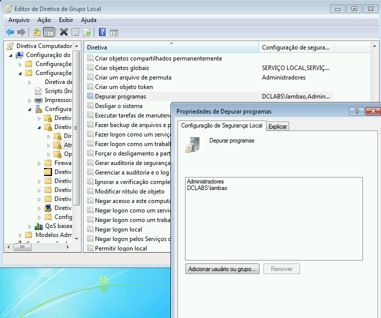 Na mesma estação, a conta de usuário ‘lambao’ foi atribuída ao direito de usuário ‘Depurar programas’, conforme exibimos na imagem abaixo: