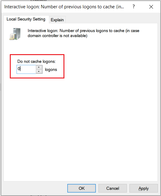 Nome da diretiva: Interactive logon: Number of previous logons to cache (in case domain controller is not available)