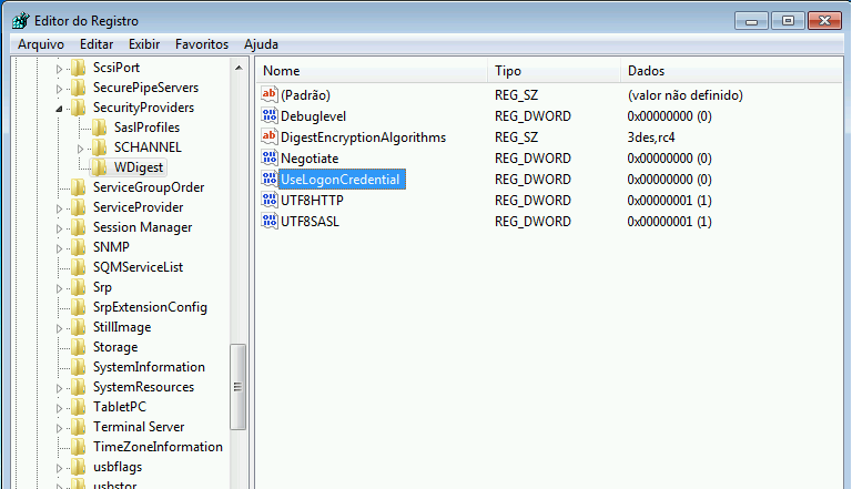 Chave de registro: [HKEY_LOCAL_MACHINE\System\CurrentControlSet\Control\SecurityProviders\WDigest\]