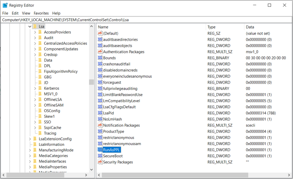 Se, após um determinado período de uso dos sistemas no modo de auditoria, nenhum driver essencial para o funcionamento do sistema operacional — e das aplicações utilizadas no ambiente — for registrado nos logs, é provável que habilitar o modo de proteção do lsass.exe não cause nenhum problema ao ambiente. Para habilitar o modo de proteção do lsass.exe, deve-se configurar a chave de registro abaixo: