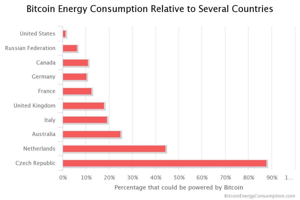 Segundo números de novembro de 2017, o consumo anual de eletricidade para minerar esta única criptomoeda era estimado em 29.05 TWh (Terawatts / hora), quantidade equivalente a 0,13% do consumo global total de eletricidade, comparável ao consumo de 159 países tomados de maneira isolada. Ainda segundo o site, a taxa de crescimento no consumo de energia relacionado à mineração de criptomoedas atingiu quase 30% entre os meses de dezembro/2017 e janeiro/2018.