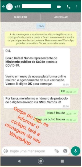 Nessa modalidade de golpe, o objetivo é a captura do código de verificação do WhatsApp e, para realizar esse feito, o criminoso investe em diferentes abordagens de engenharia social, sendo a supracitada, a mais comum.