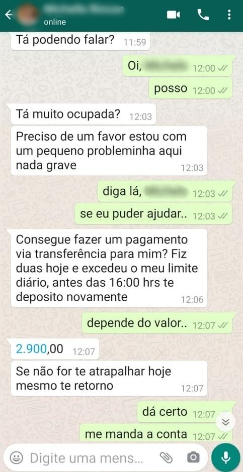 Muitas vítimas não percebem que o código fornecido ao criminoso é o próprio código de autenticação do aplicativo e, ao entregar essa chave de acesso, permitem que o fraudador se conecte à sua conta do WhatsApp em outro aparelho. Como consequência disso, a vítima geralmente perde o acesso à conta. Em seguida, o fraudador aborda a lista de contatos buscando por familiares e amigos a fim de fazer novas vítimas, dizendo que precisa de uma transferência urgente e informa seus dados bancários, como no caso a seguir.