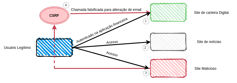 O primeiro passo do atacante é identificar um usuário válido no site através da enumeração de usuários. Em seguida, o atacante dispara um e-mail para a vítima enumerada anteriormente. Esse e-mail vai conter um link, para uma aplicação de sua posse, ilustrando uma promoção qualquer. Quando a vítima acessar tal página, será acionada uma chamada à funcionalidade do CateiraDeCouroDigital (onde o usuário legítimo está devidamente autenticado em uma aba no mesmo perfil do site acessado). A chamada em questão tem a capacidade de alterar o endereço de e-mail da vítima (neste caso de [email protected] para [email protected]). Como a aplicação não possui nenhuma solicitação de um fator de autenticação para a troca de dados cadastrais (a senha de acesso, por exemplo) fica fácil para o invasor realizar essa chamada falsificada em nome do usuário legítimo. A imagem a seguir ilustra a investida descrita anteriormente: