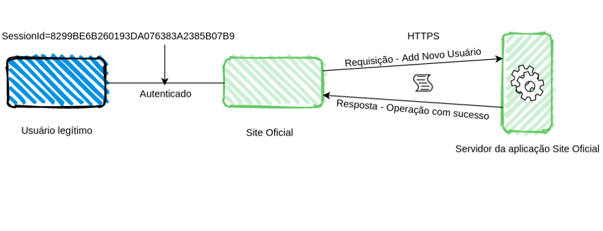 Uma aplicação web chamada SiteOficial gerencia informações financeiras de uma grande instituição. Um usuário com permissão administrativa encontra-se devidamente autenticado e utiliza a funcionalidade de adição de novo usuário para um recém integrante do time. A Figura2 representa tal cenário e algumas informações sobre tal fluxo: