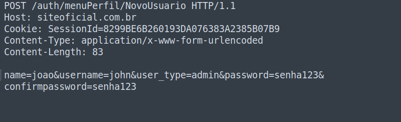 Uma vez que a página maliciosa é acessada no mesmo perfil de browser em que a vítima esteja autenticada na aplicação SiteOficial, a página irá submeter automaticamente o formulário ilustrado na Figura4 para a aplicação alvo. Assim, a função para adicionar um novo usuário será executada sem que a vítima perceba. Isto ocorre porque o navegador da vítima irá inserir automaticamente o cookie de sessão, “SesseionId” (demonstrado na Figuras 2 e 3), para a aplicação vulnerável, SiteOficial.