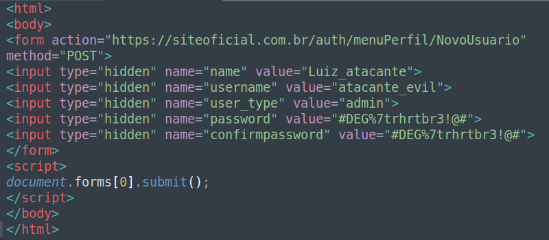 A intenção do atacante é a de realizar uma chamada falsificada de requisição mostrada previamente através de um outro site, induzindo o navegador de sua vítima a executar a requisição de forma não autorizada e o sem consentimento do usuário. Na Figura4 vê-se o trecho de código que o atacante construiu em sua página web maliciosa, onde ele define os valores dos parâmetros: