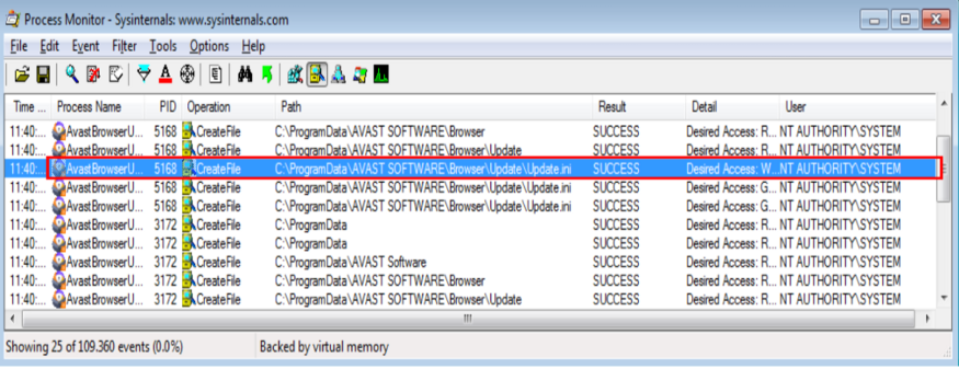 Tomando como base esse diretório, foram criados alguns filtros com o ProcMon (também parte do Sysinternals) que possibilitaram monitorar qualquer operação por parte de um processo privilegiado com o arquivo Update.ini. Como pode ser constatado na Figura 2, é possível notar um processo chamado AvastBrowserUpdate.exe realizando algumas operações no arquivo Update.ini: