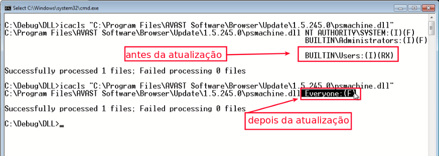 O próximo passo foi substituir o arquivo Update.ini por um hardlink que aponta para o arquivo C:\Program Files\Avast Software\Browser\Update\1.5.245.0\psmachine.dll e iniciar o processo de atualização. Dessa maneira, as permissões da DLL psmachine.dll foram redefinidas para controle total a qualquer usuário (como observado na figura 3).