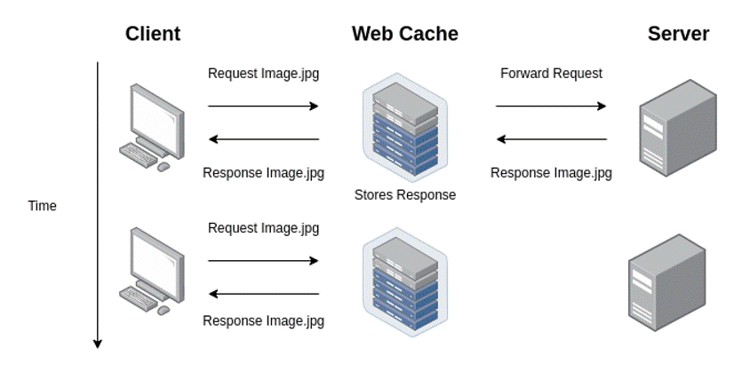 Os conteúdos de aplicações web podem ser armazenados em vários tipos de cache, como caches de navegadores e cache de um servidor intermediário. No exemplo da imagem anterior, como também nos próximos exemplos deste artigo, os conteúdos são armazenados em um cache intermediário, da forma de um proxy reverso.