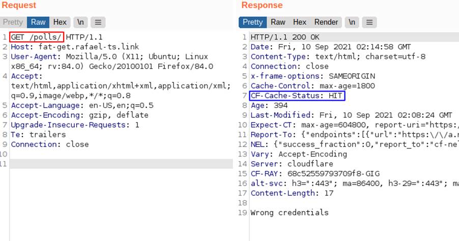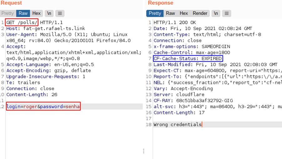 No caso, o servidor entende como se fosse uma tentativa de login, mas como essa requisição é um GET, o conteúdo retornado ficará salvo na memória do cache para a chave com método “GET”, caminho da requisição “/polls/” e cabeçalho host “fat-get.rafael-ts.link”. O status do cache é expired nesse caso, sendo um comportamento parecido com o miss, mas informando que o que estava salvo, anteriormente, foi expirado: