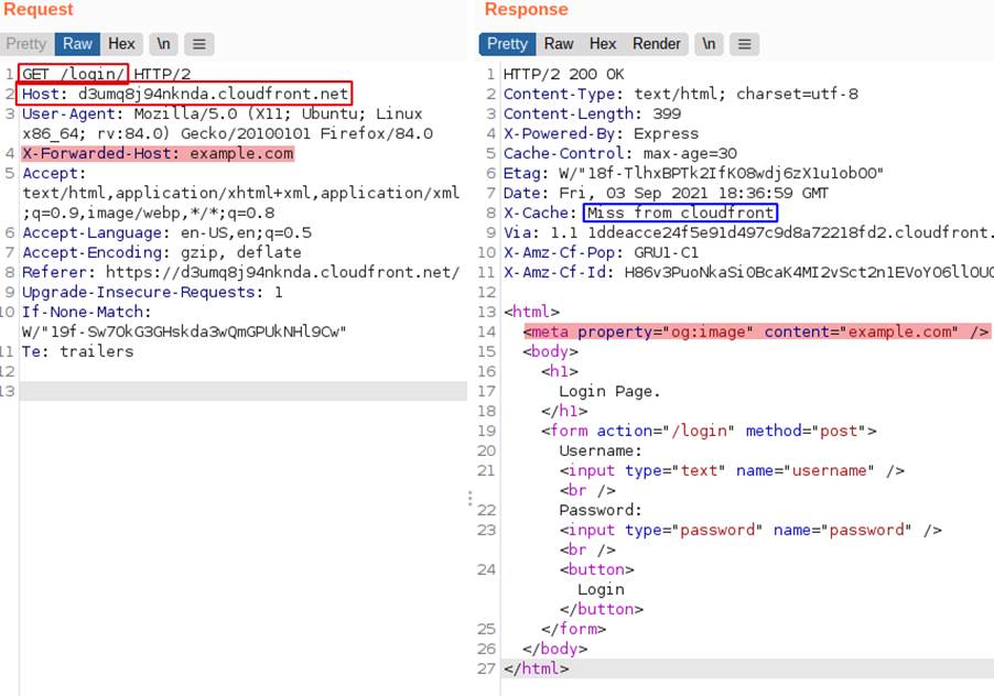 No exemplo a seguir temos o cabeçalho X-Forwarded-Host da requisição sendo refletido na tag meta da resposta, como podemos ver na imagem: